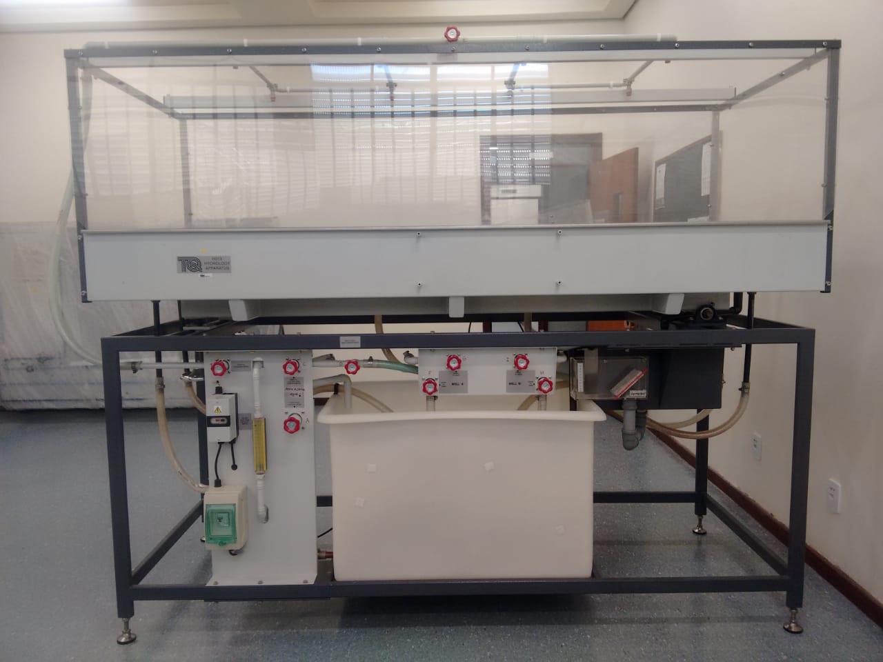 Banco portátil e autônomo para uma variedade de acessórios para o estudo da hidrologia.